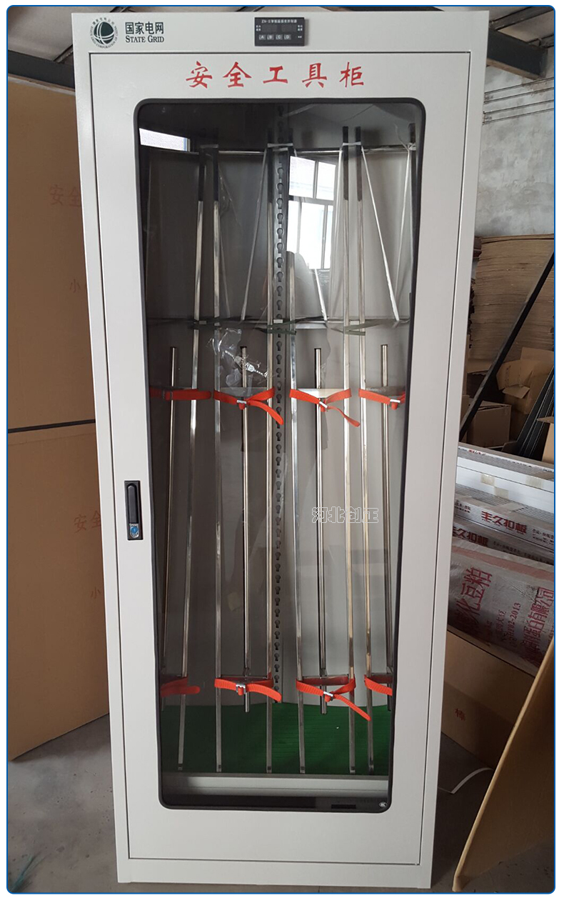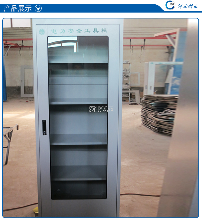 1、柜體是冷軋鋼板卷壓成型,厚度有1.0mm,1.2mm,1.5mm供選擇。柜體表面采用靜電防腐噴塑工藝,顏色為駝灰色,柜門裝有通體透明鋼化玻璃,透過玻璃可以看到分類有序的工器具。